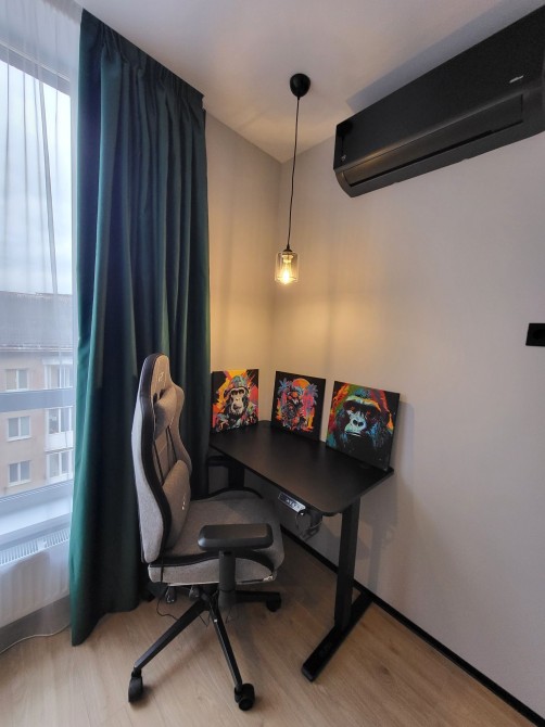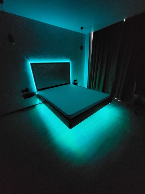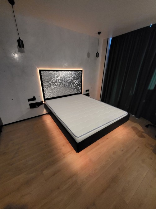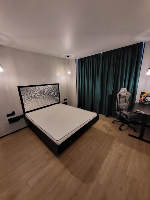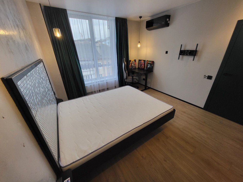 В спальні цупкі блекаути з 100% поглинанням світла, робоче місце зі столом, в якого регулюється висота, і крісло з масажною подушкою. Левітуюче ліжко з підсвіткою, новий матрац