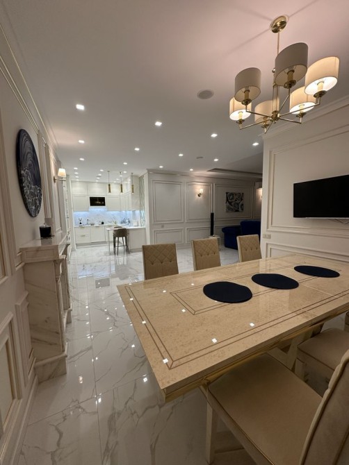 Квартира складається з просторої кухні-вітальні, 2 окремих спалень, 3 гардеробних, 2 ванних кімнат, господарського блоку. Є всі необхідні меблі, побутова техніка, сейф, бойлер + центральна гаряча вода, система теплої підлоги, мультирум-аудіо система, смарт ТВ. Під час блекауту в будинку працюють ліфти ( генератор) , є вода та опалення.