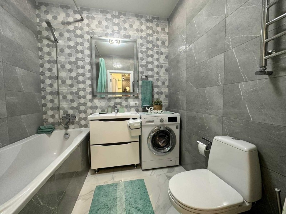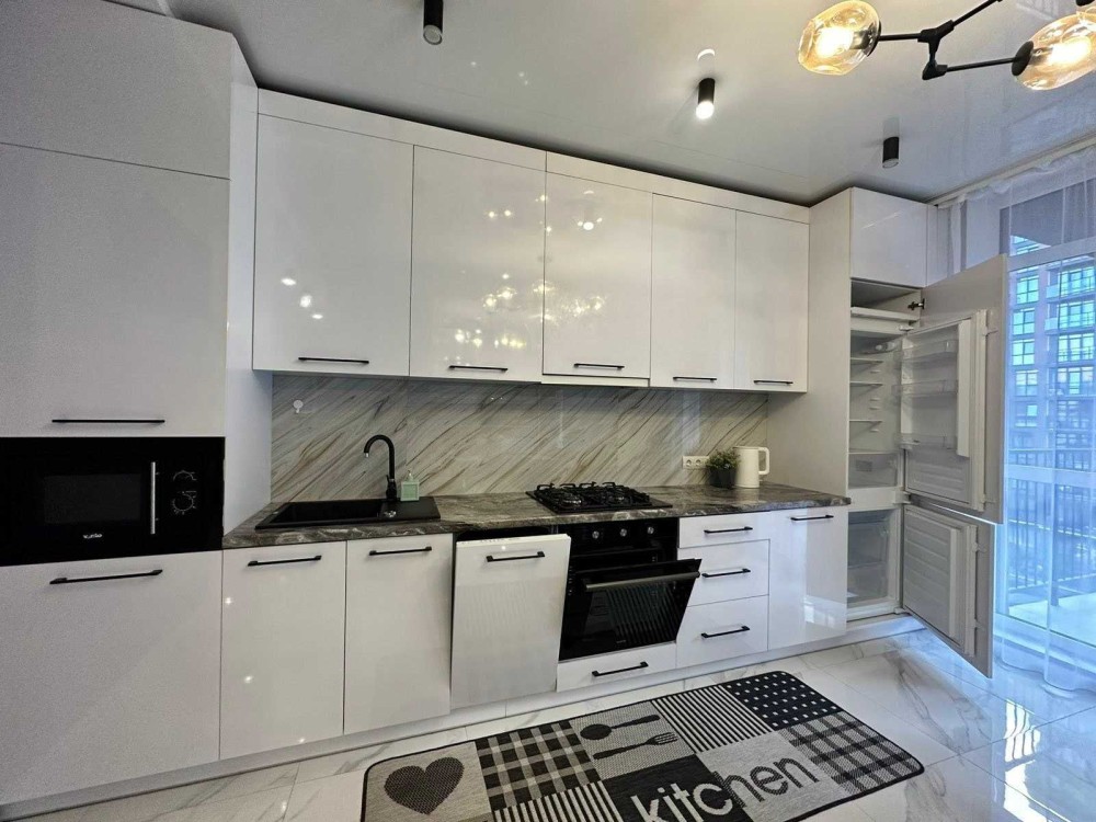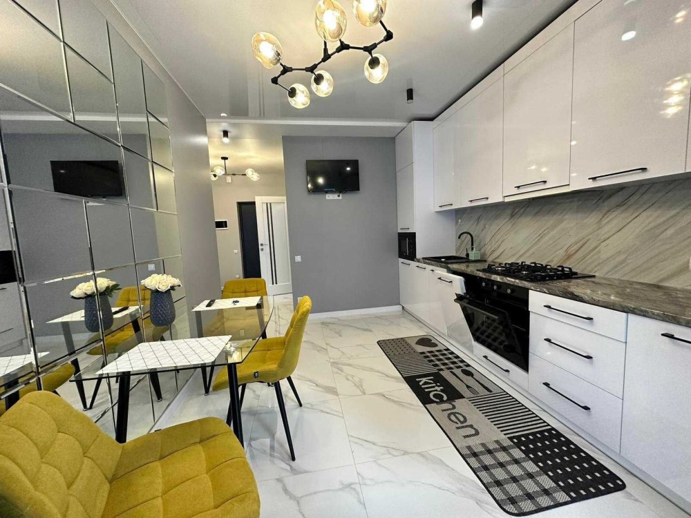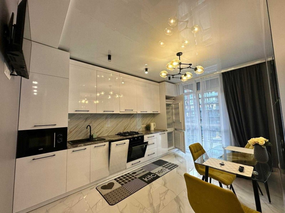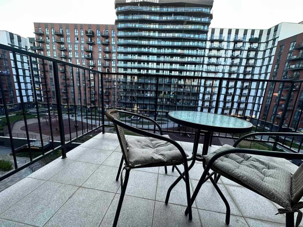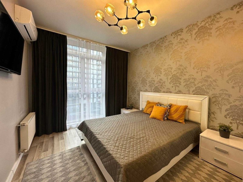 Є спальня, простора кухня, балкон та панорамні вікна. Встановлено індивідуальне опалення та підігрів підлоги. Квартира повністю облаштована новими меблями: двоспальним ліжком, диваном і місткою шафою. Є вся необхідна побутова техніка: пральна та посудомийна машини, холодильник, духовка з варильною поверхнею, мікрохвильова піч, два телевізори, пилосос, праска, електрочайник і повний набір посуду.