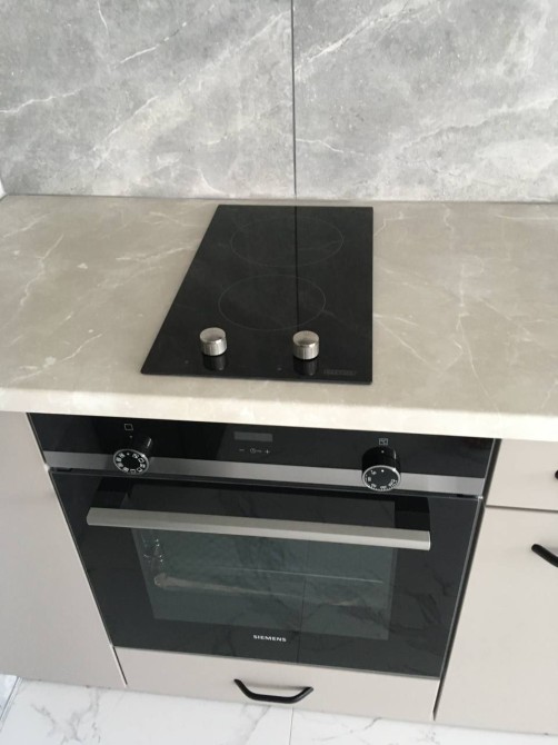 Мебльована кухня (холодильник, електрична плита, раковина, кран, мікрохвильова піч, барна стійка, духовка.)