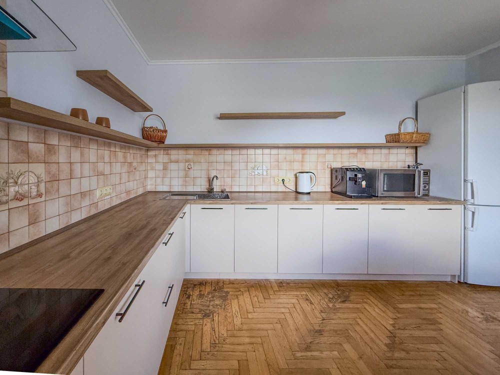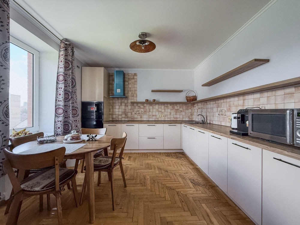 Spacious two-level apartment in a modern building with underground parking (personal spot) and a gated courtyard with guest parking. The building has 24/7 security and a private homeowners association (OSBB), with an autonomous gas boiler system.