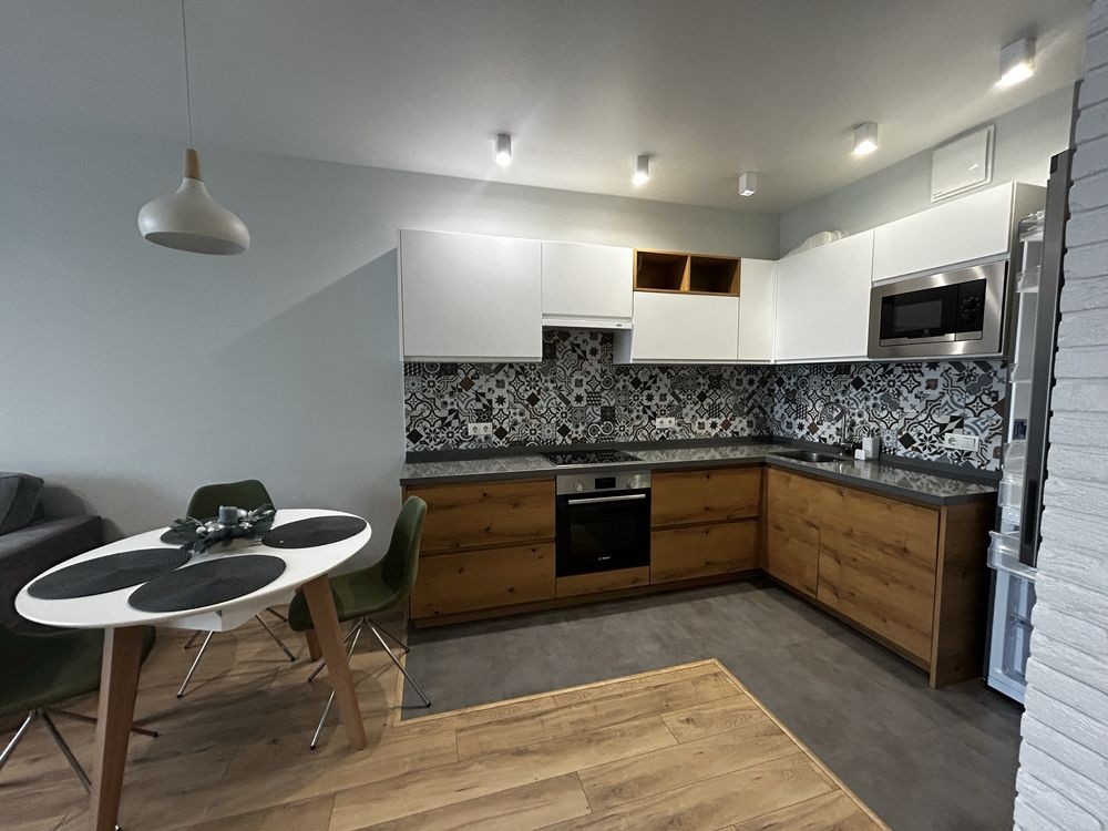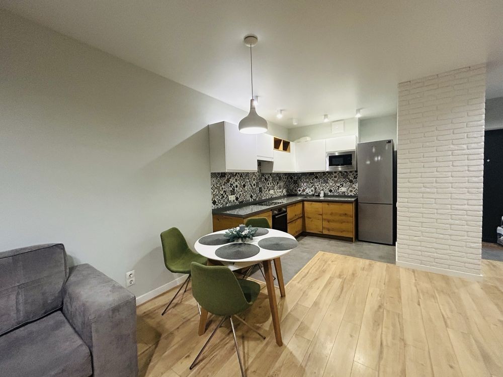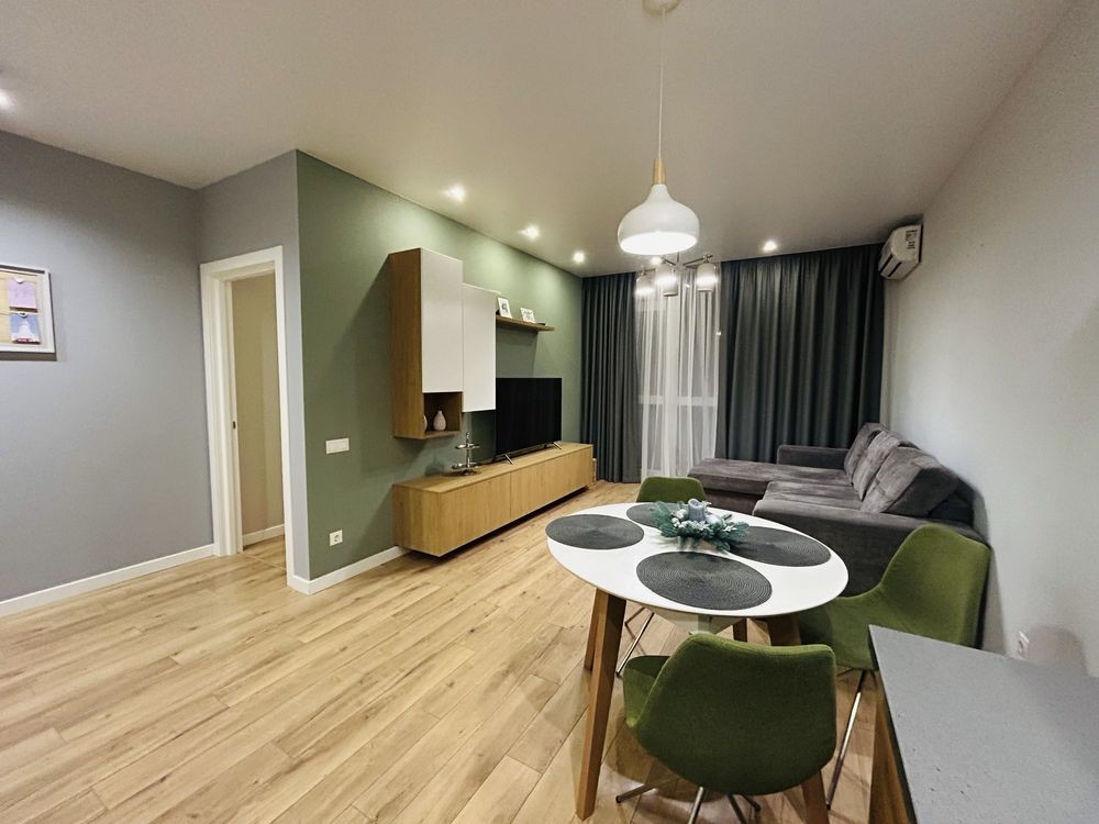 Квартира складається з просторої спальні, функціональної кухні-вітальні, великої гардеробної, та суміжного санвузла. Укомплектована всіма необхідними меблями та технікою (холодильник, телевізор, пральна та посудомийна машини, бойлер, мікрохвильова піч, два кондиціонери, праска, фен). В квартирі зроблено якісний, сучасний ремонт.