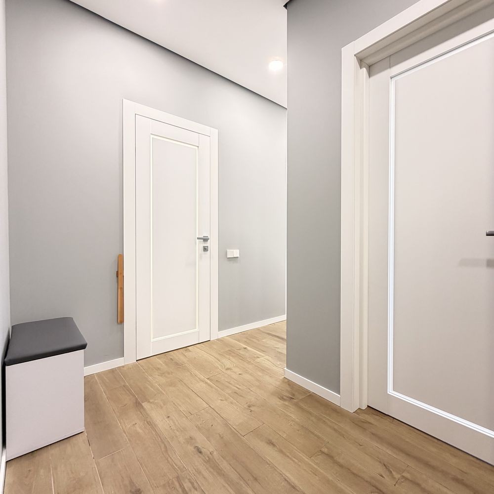 Квартира виконана в нейтральних тонах, дуже світла та простора. Вікна виходять у двір, що забезпечує тишу та комфорт.