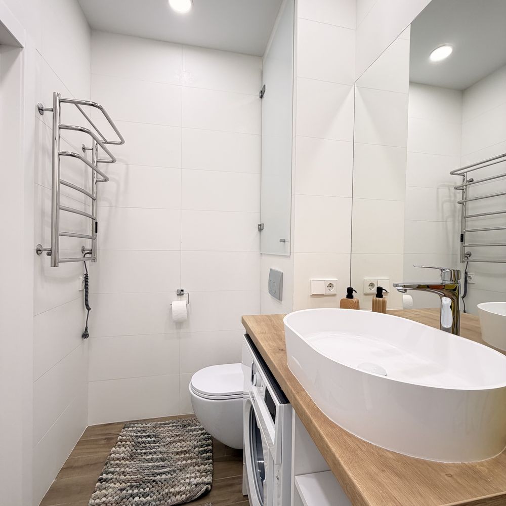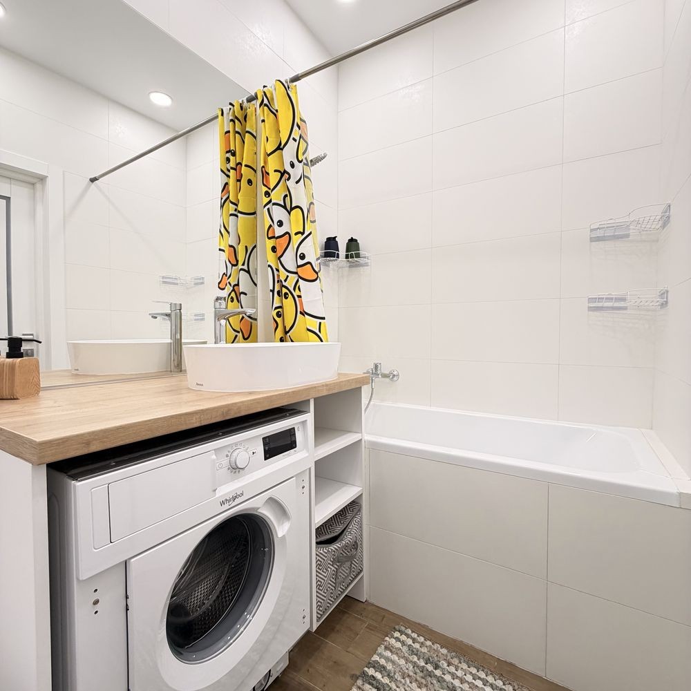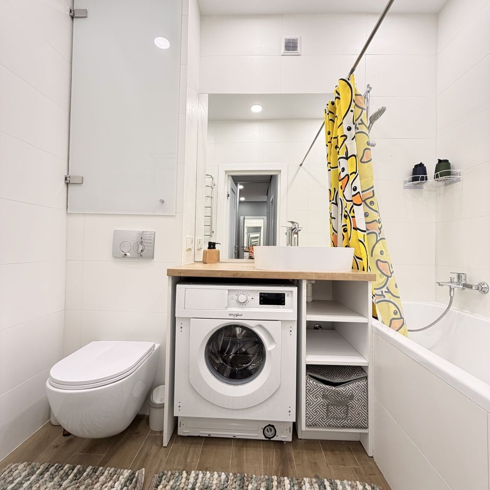 У ванній кімнаті встановлені ванна, пральна машина, бойлер та рушникосушарка.