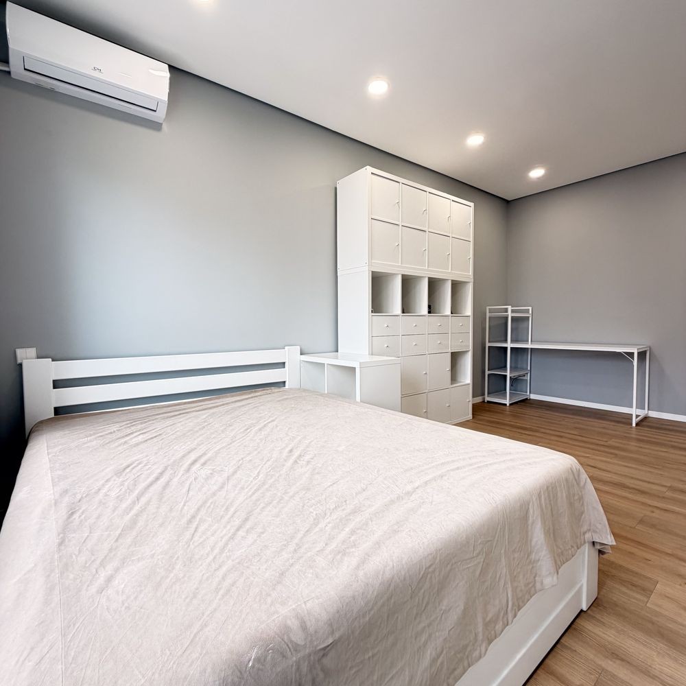 Спальня обладнана великим двоспальним ліжком з матрацом, робочим столом, шафою-стелажем та кондиціонером.