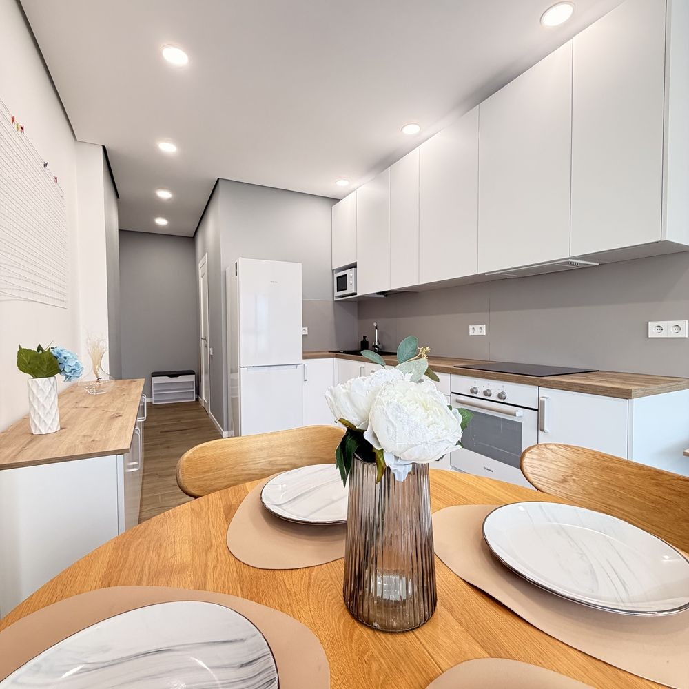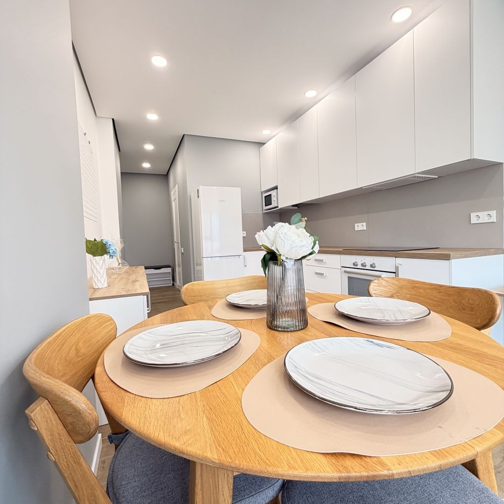 Кухня повністю укомплектована якісною технікою: холодильник, мікрохвильова піч, духова шафа, варильна поверхня, посудомийна машина, витяжка, фільтр для питної води та кондиціонер. Також є обідній стіл зі стільцями та зручний диван у зоні відпочинку.