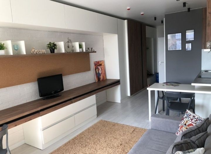 Пропонується в оренду квартира-студія в ЖК Акварелі-2. Квартира-студія, невелика (20 кв.м.), але укомплектована всіма необхідними меблями та технікою. В кімнаті: диван, письмовий стіл, шафа, комод,кондиціонер, телевізор, інтернет. Санвузол поєднаний (душова кабіна, бойлер, пральна машина). Доглянута територія ЖК з великою кількістю кавярень, магазинчиків та салонів краси. Хороша транспортна розвязка: маршрутки до Теремків, Подолу, Печерську, ВДНГ, Академмістечка, Житомирської і т.д. Біля будинку супермаркети Новус, "АТБ". Вартість оренди 9500 грн. комісія: 50%