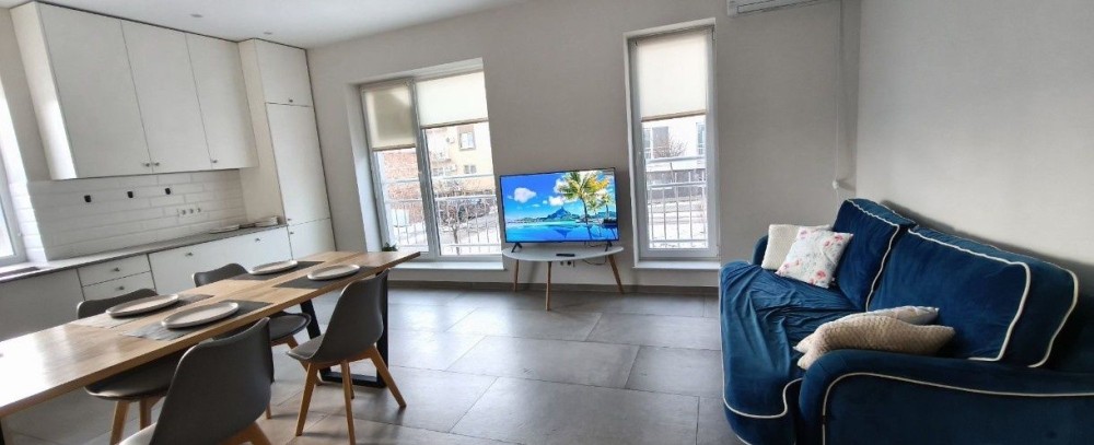 Квартира з дизайнерським ремонтом, сучасні меблі та побутова техніка.