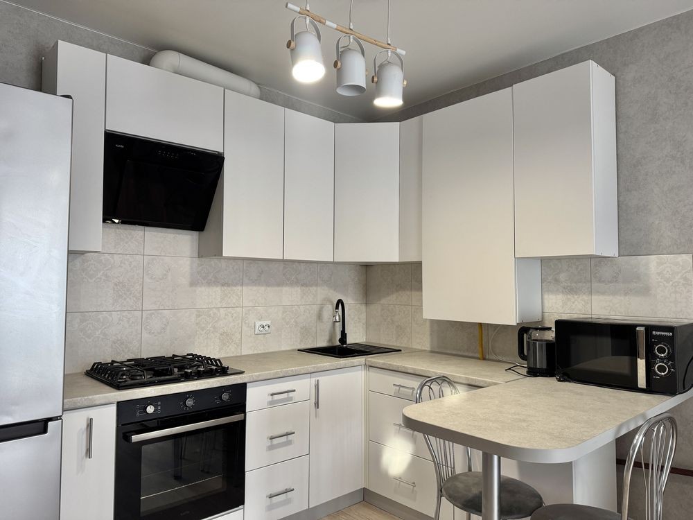 • меблі: кухня, двоспальне ліжко, диван, шафа-купе, барна стійка та стільці