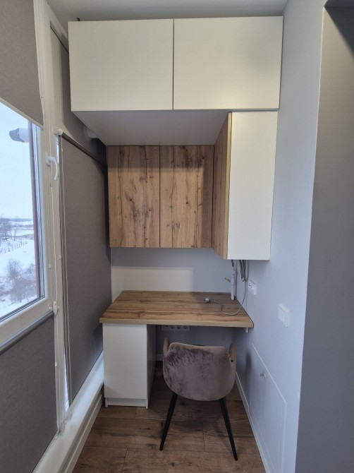 На лоджвї є облаштовано робоче місце ,великі панорамні вікна дають багато світла ,тому працювати буде зручно.