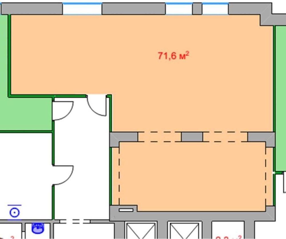 Площа -71,6 м2, з коефіцієнтом загальних площ (1,17) - 83,77 м2.