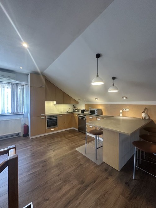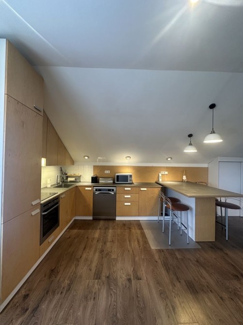 Кухня виконана у сучасному стилі з великою робочою поверхнею та барною стійкою, де зручно снідати або працювати з ноутбуком
