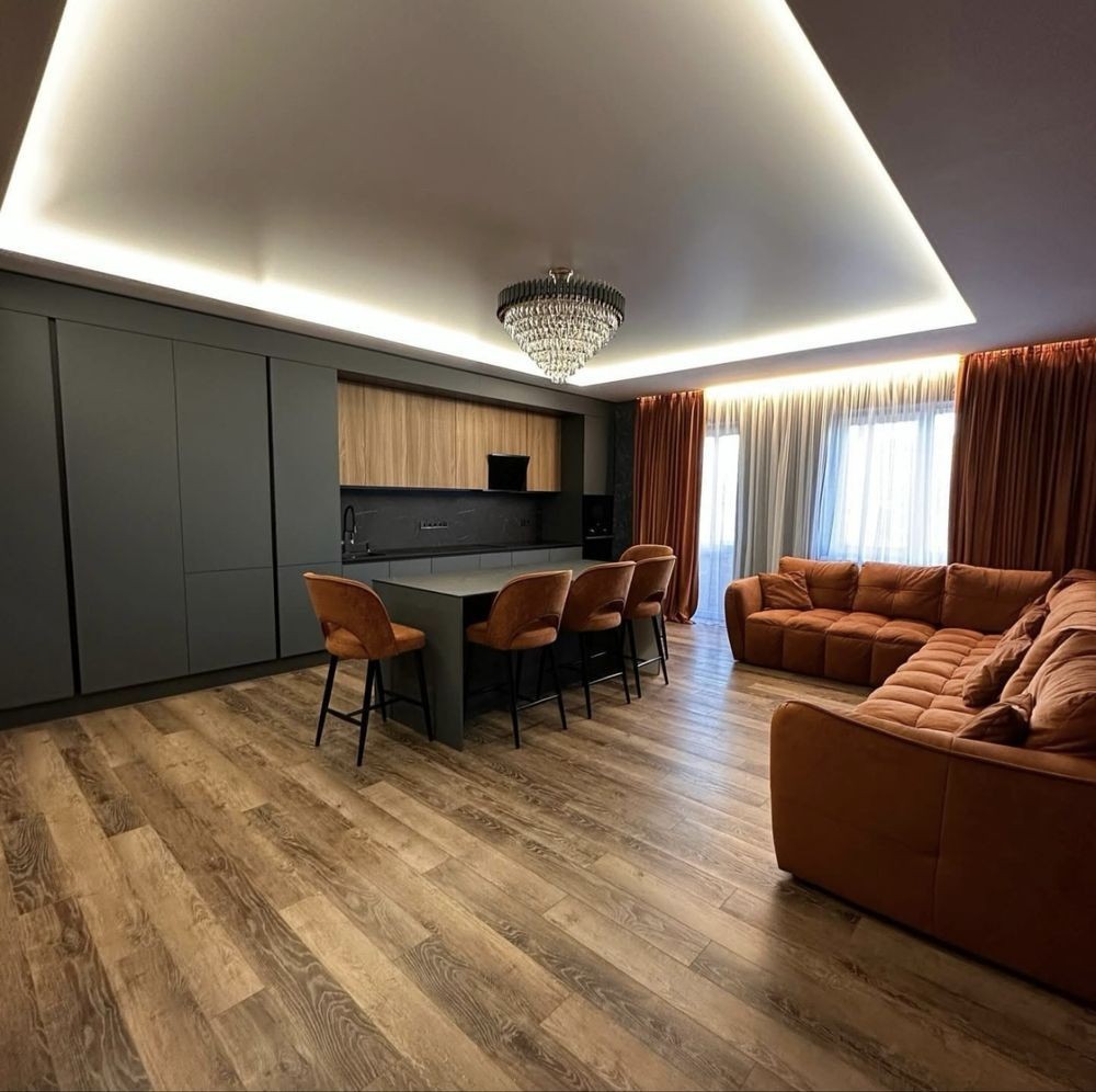Техніка: посудомийка, великий холодильник, варочна поверхня, кондиціонер, пральна машина, духовка, 3 телевізори.