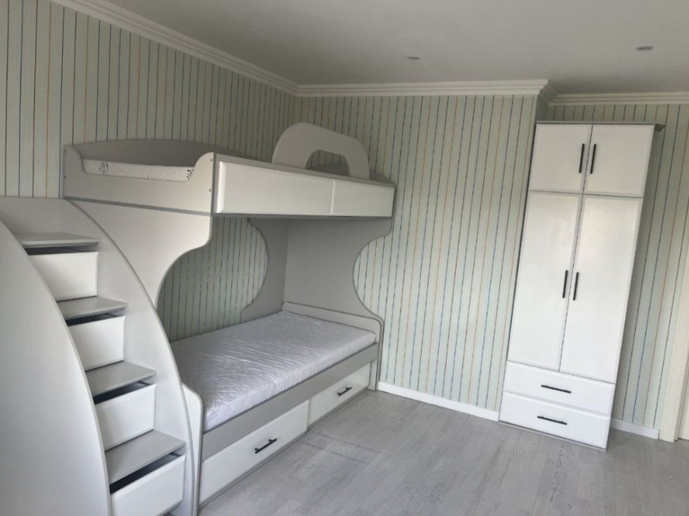 Світла спальня з двоспальним ліжком та великою гардеробною. Друга спальня з двоярусним ліжком, що ідеально підійде для сімʼї з дітьми. Сучасна ванна кімната з пральною машиною.