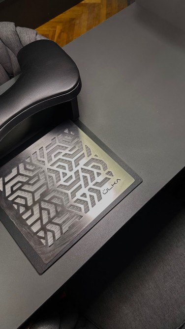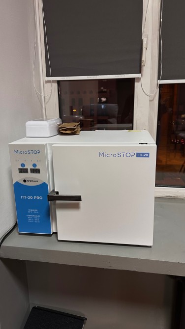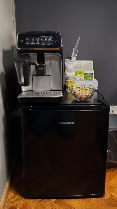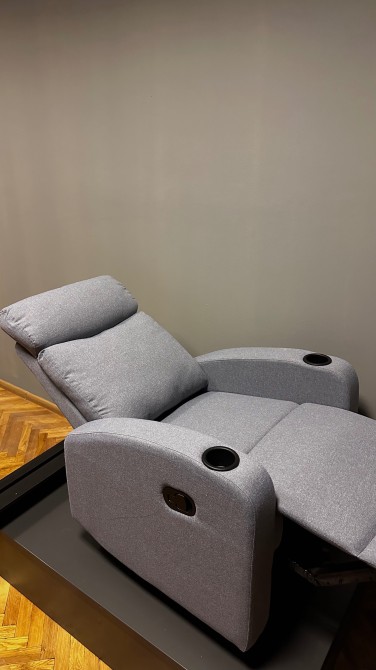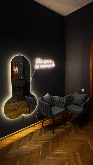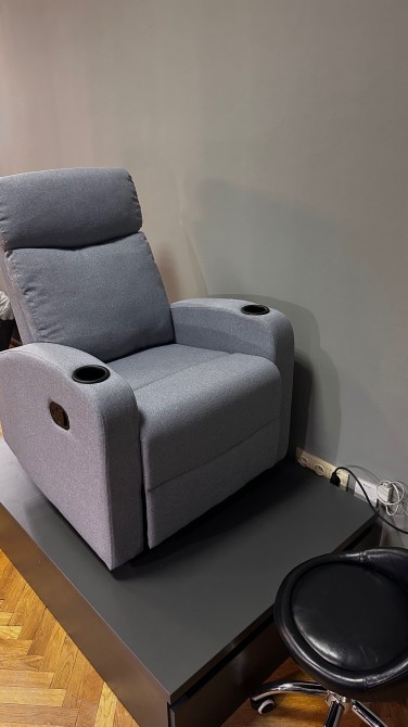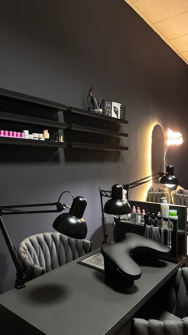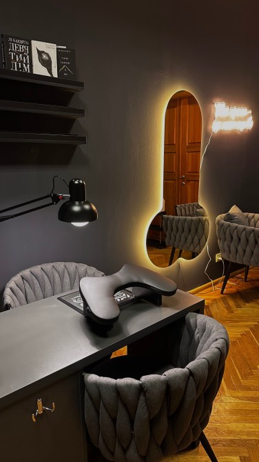Зона очікування, кавовий апарат, автоклав для стерилізації інструментів, місце для педикюру, невеликий холодильник, дзеркало, витяжки для манікюру, кондиціонер та шафи для ваших речей
