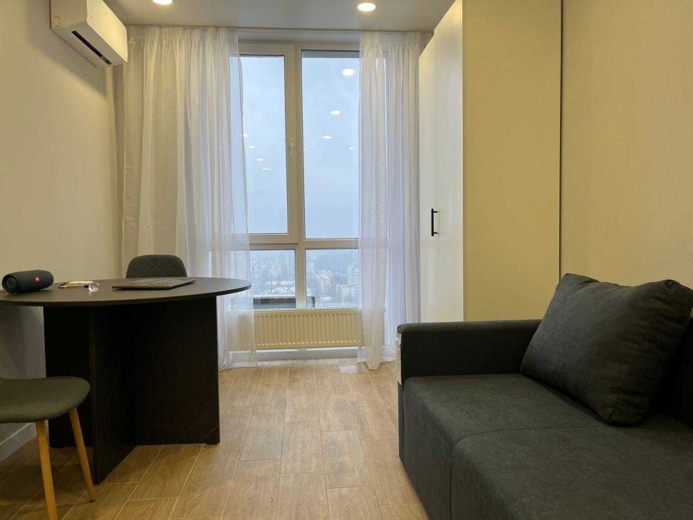 Довгострокова оренда Смарт-квартири в ЖК 4U. Будинок новий, 2-га секція, вул.Мудрака, 1В. Площа 22кв., 26 поверх, вікно на ліс та Захід. Локація вдала: 10 хв. пішки від метро «Академмістечко», 7 хв. до зал.станції «Новобіличі». 1,5 км від ЖК зелена зона «Лісова поляна», сосновий ліс. ТВ, кондиціонер, електрочайник, варильна поверхня, холодильник вбудований, пральна машина, бойлер. Диван розкладний. Будинок монолітно-каркасний, вікна з п'ятикамерним профілем і товщиною склопакета до 41 мм, підлога - керамограніт. Висота стелі 2.7m. В домі є ГЕНЕРАТОР та автономне ОПАЛЕННЯ. Тобто, при відключенні електроенергії, у квартирі присутні опалення та вода, а також працюють ліфти та освітлення місць загального споживання.