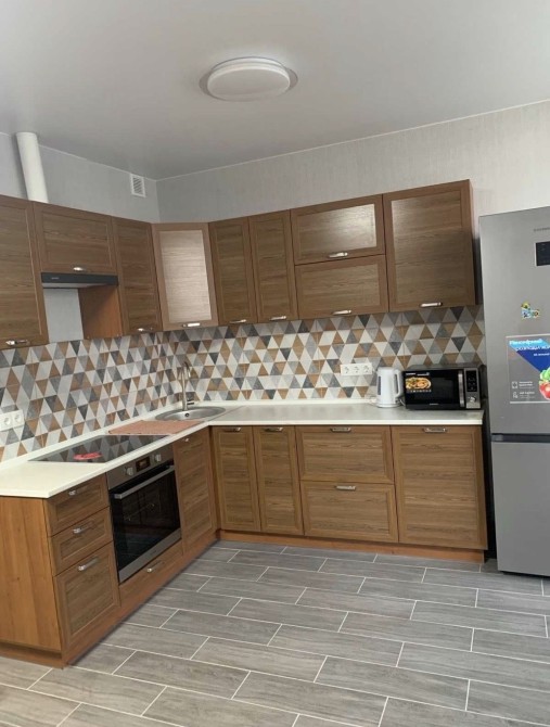 Повноцінна кухня з побутовою технікою, обідня зона, розкладний диван.