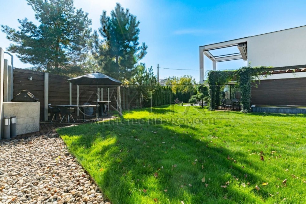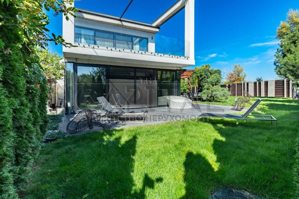 Аренда современного двухэтажного дома 500 м² на Острове Водников в Киев — авторский проект Сергей Махно в стиле хай-тек и минимализм со вторым светом, панорамными окнами и высокими потолками; просторная гостиная с кухней и выходом на террасу, 4 спальни, кабинет, кинотеатр, сауна с бассейном, полная комплектация мебелью и техникой, теплые полы, охрана, участок 10 соток с ландшафтным дизайном и открытым бассейном с подогревом.