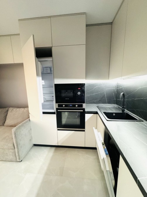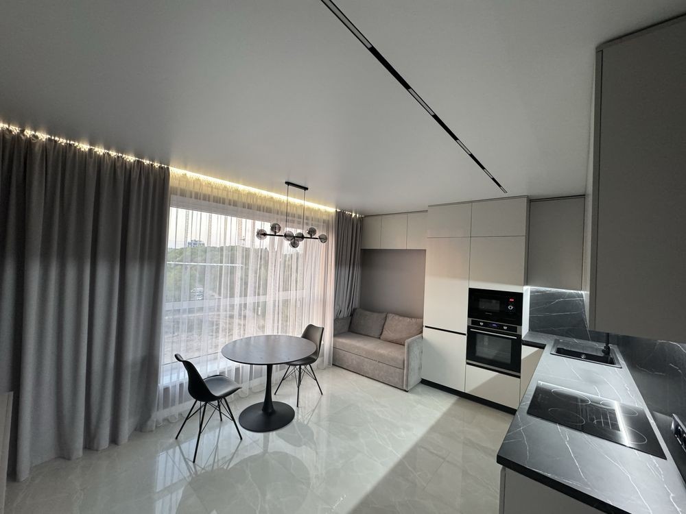 - сучасні меблі ( вмонтована кухня із різними типами освітлення; комфортний розкладний диван )