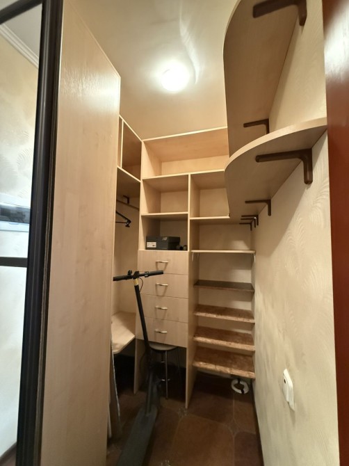 • Планування: кухня винесена на лоджію, що дозволило звільнити простір для просторої спальні та місткої гардеробної.