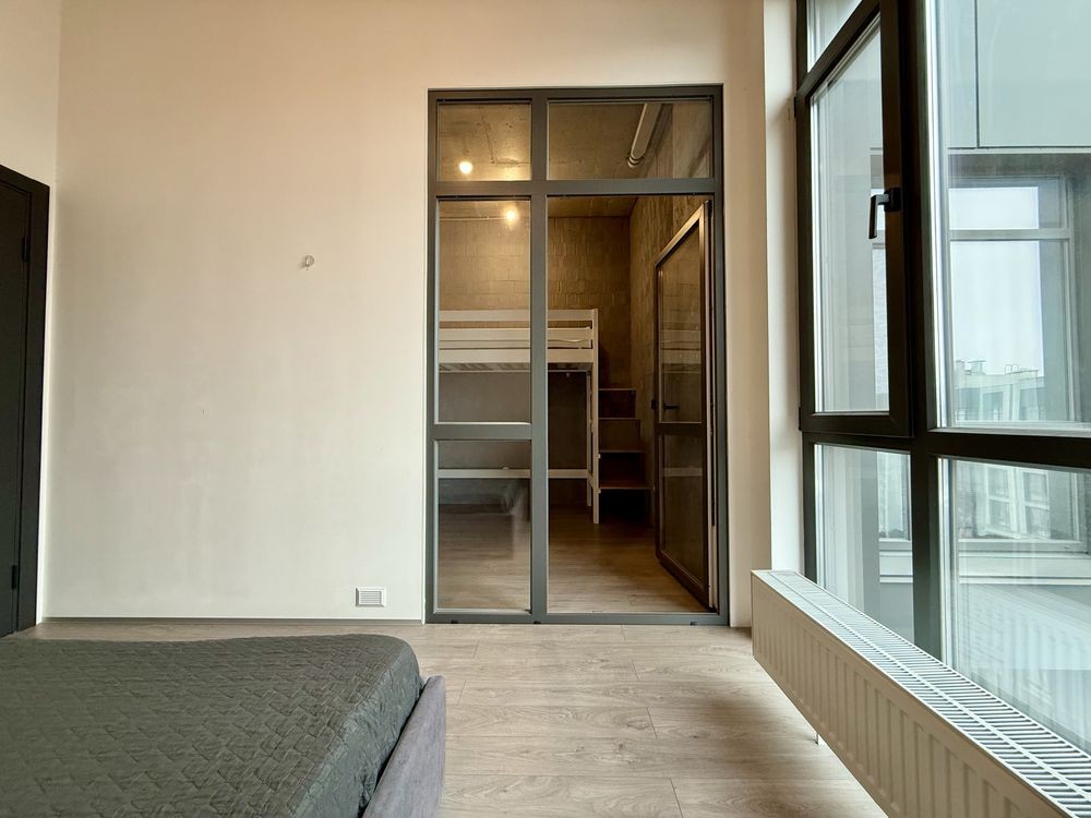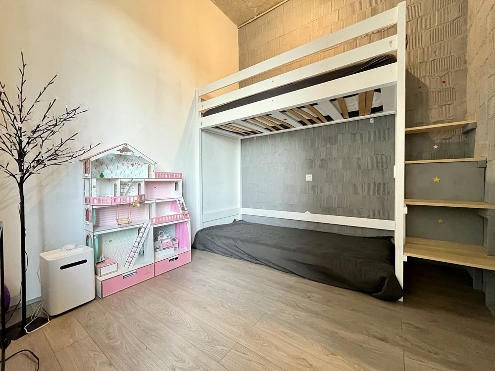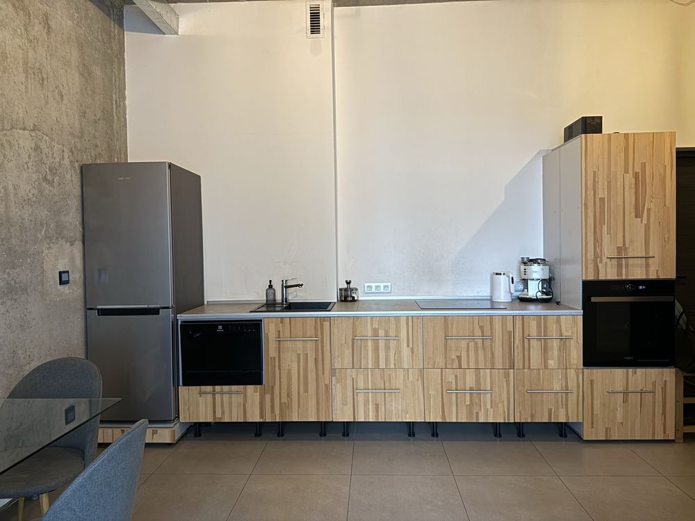 - Велика кухня-студія + спальня розділена на дитячу зону та дорослу.
