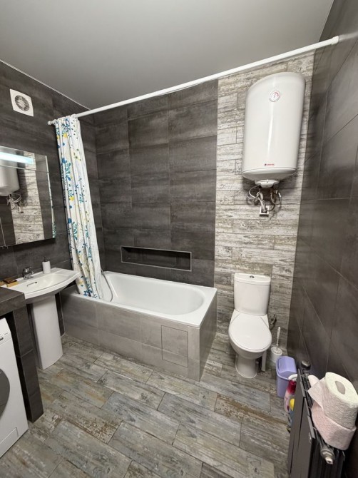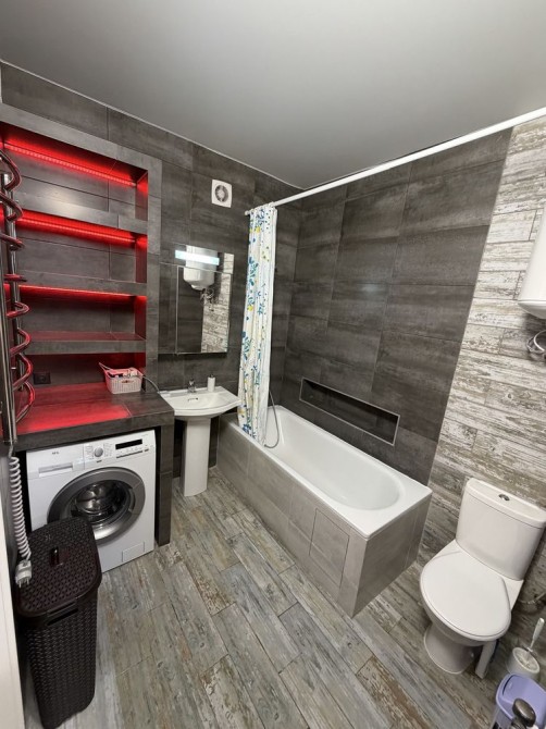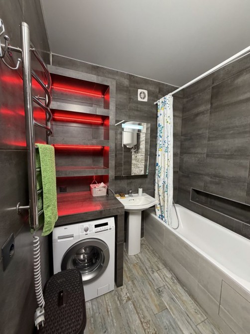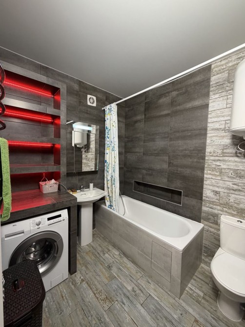 Побут: Посуд, електрочайник, мікрохвильовка, холодильник Snaige (180 см), пральна машина AEG, пилосос, праска, фен — все залишається!