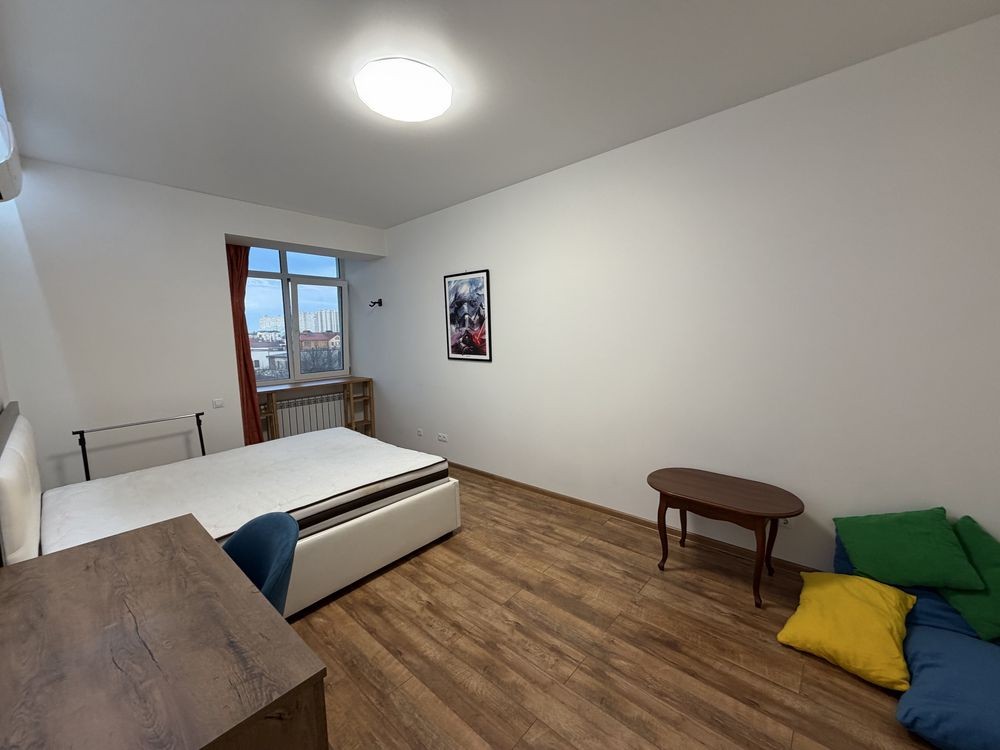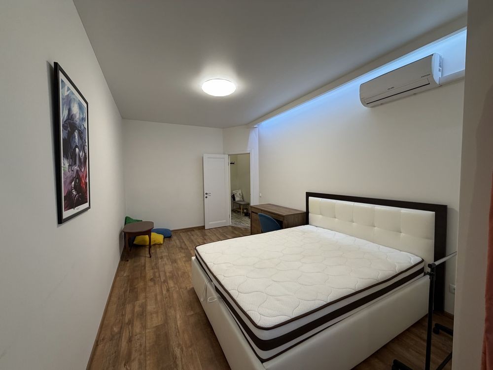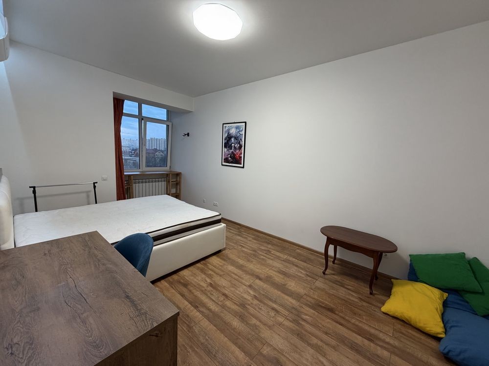 Меблі: Зручне двоспальне ліжко (1.60×2.0) з місцем для зберігання та великий розкладний диван (1.60×2.0). Є дві робочі зони для тих, хто працює віддалено.