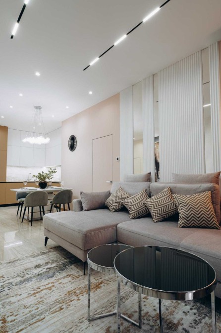 Кухня-студія: Серце квартири — простора кухня-студія, ідеальне місце для зборів близьких та друзів. Вишуканий дизайн простору підкреслює індивідуальність, а функціональне розміщення елементів робить кожен вечір неповторним.