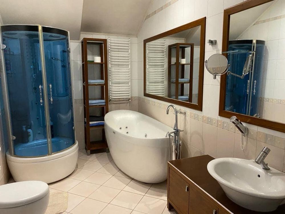 Общая площадь основного дома: 475м.кв., кирпич, фасад утеплён каменной ватой, использован камень- производство Греция, бронированные окна, система туман-охлаждение воздуха на терассе и у открытого бассейна- противоток, маркиз, подсветка. Система кондиционирования. Второй свет,2 гостевые, кухня, кабинет, спа зона, мастер спальня с санузлом, гардероб, 2 гостевые спальни,санузел.
