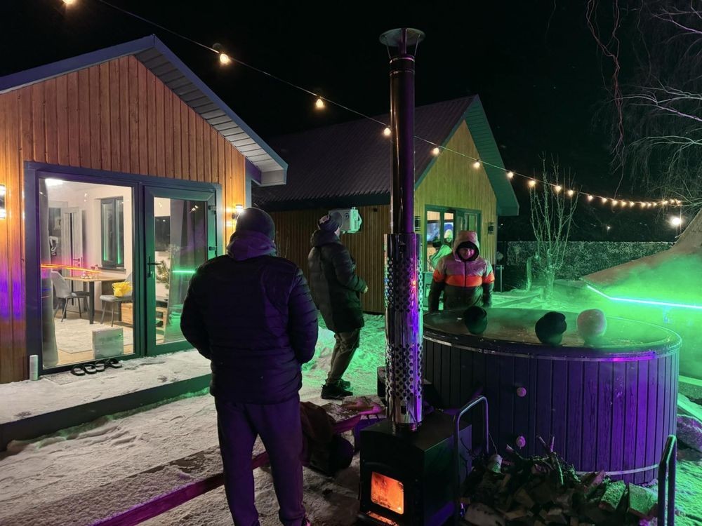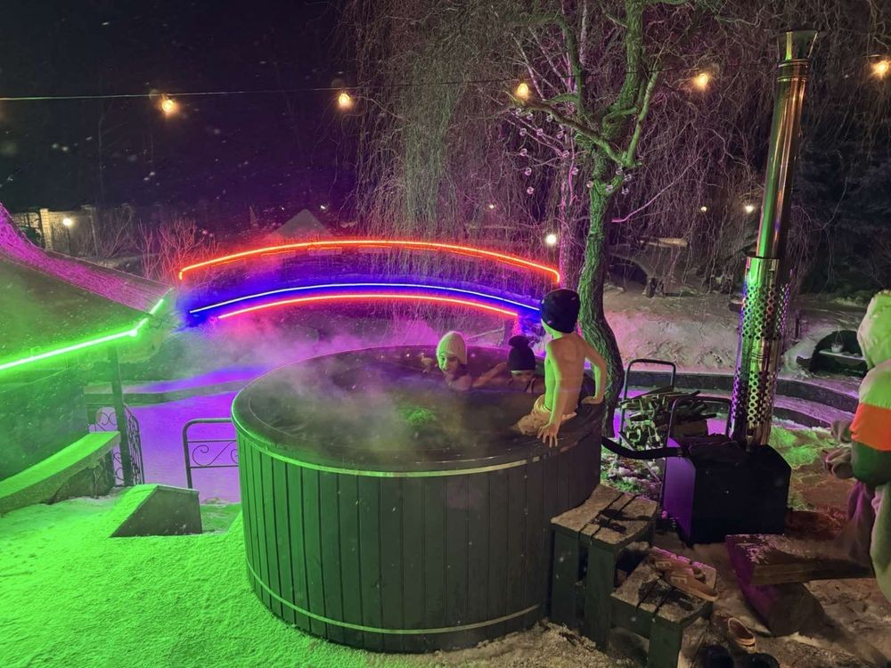 Ціна від 10000 грн. До 7 гостей -10000 грн за добу. Лазня та басейн оплачується окремо 5000 грн за добу або погодинно -1000 грн за годину.(Мінімум 4 години). Доплата за кожного наступного гостя 1000 грн. П’ятниця ,субота та неділя вартість оренди на 1000 грн вище. 332 Будинок-зруб з басейном з підігрівом та лазнею. 3 великі спальні, розрахований лише до 12 гостей, за стіл можна розмістити до 12 гостей та спальних місць 9. Приймаються тільки не гучні компанії. На території є альтанка з зоною барбекю, мангал, тенісний стіл. На першому поверсі: зал-студія, басейн з підігрівом та лазня. На другому поверсі 3 роздільні, просторі спальні. Лазня, басейн та квадроцикл оплачується окремо. Також можлива оренда без лазні та басейну. Будинок повністю обладнаний для комфортного проживання, є всі необхідні меблі та побутова техніка, є стіл на 8 персон та камін.