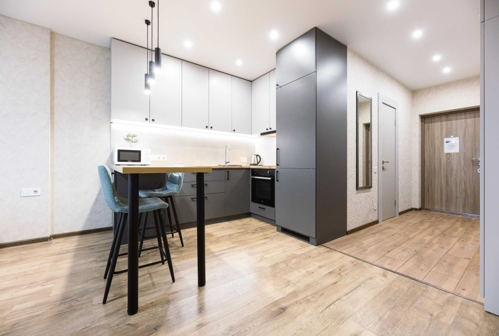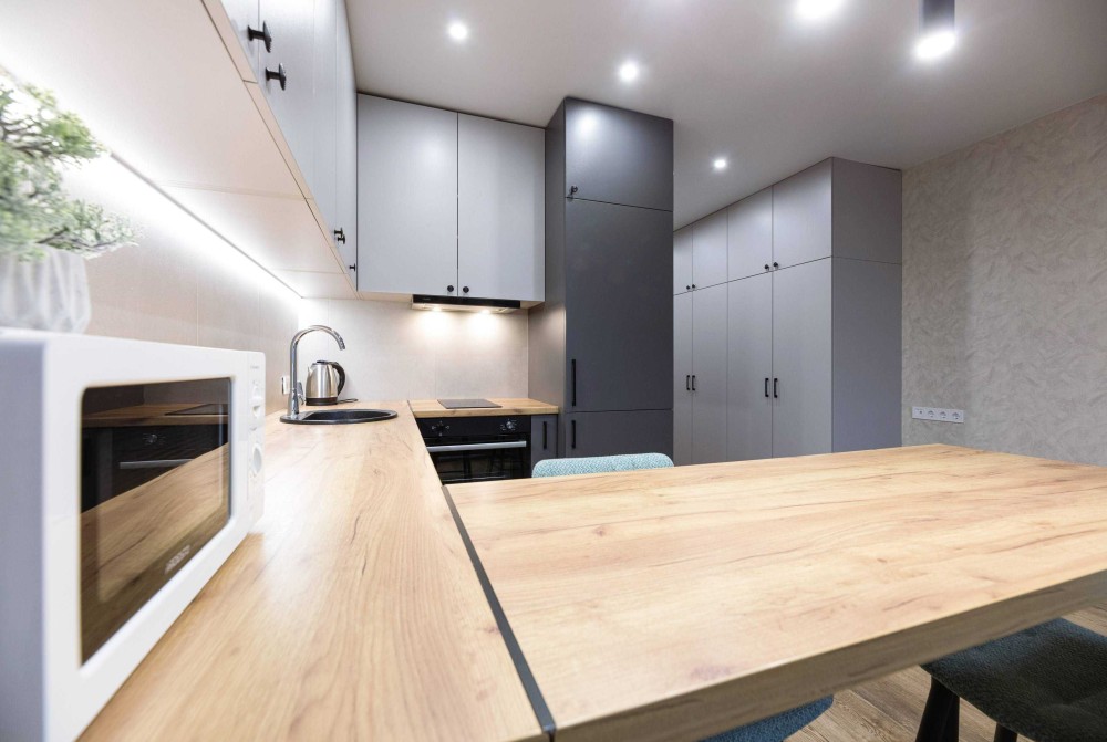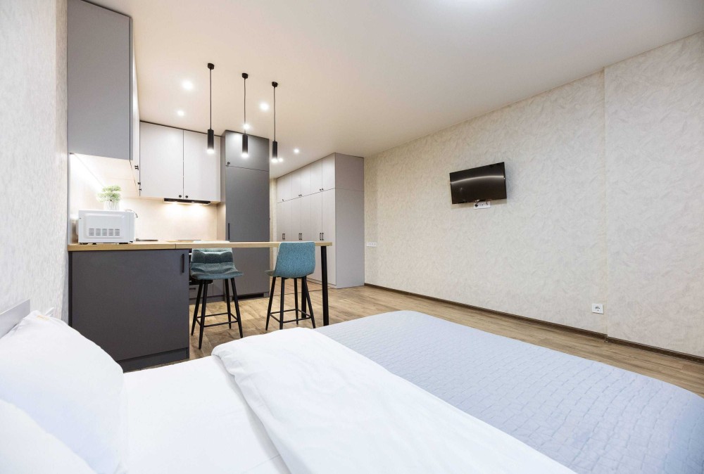 В квартире очень тепло в холодное время, а летом прекрасно работает кондиционер. В квартире полностью выполнен новый ремонт с елементами дизайна потолка и стен. Два телевизора с цифровыми каналами. Отличная мебель. Большая двуспальная кровать. Кухня полностью оборудована для приготовления пищи со всей техникой, включая стиральную машину. Очень удобная ванная.