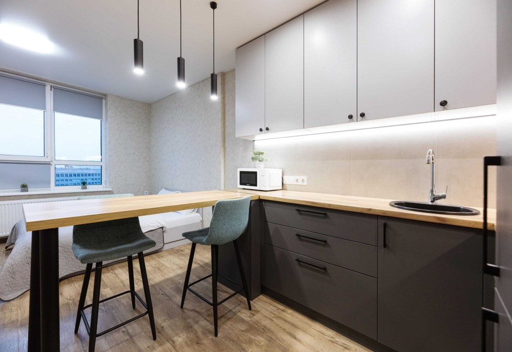 двоспальне ліжко, кухня з обідньою зоною та посудом