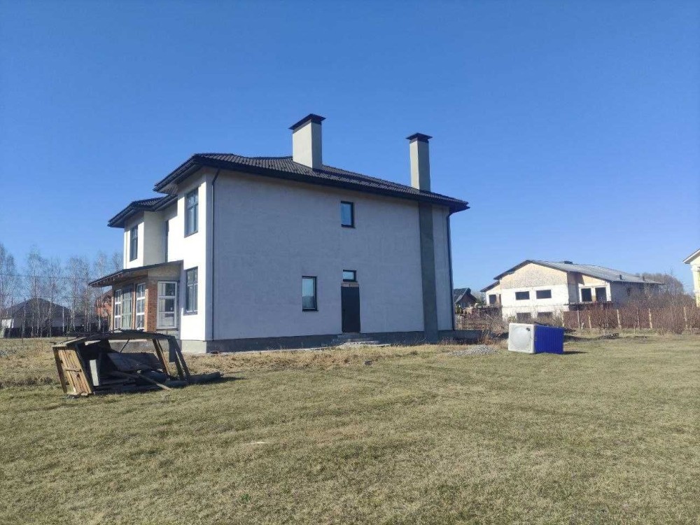 Погреби. Продам новий будинок 350кв.м (286кв.м + 64кв.м), стан - без оздоблення, будинок будувався з якісних матеріалів, біля кожної спальні розташована гардеробна кімната, ділянка 18сот, стіни газоблок AEROC, утеплено все - мінвата 200мм, дах - металочерепиця BRAAS, панорамні вікна, теплозберігаючі склопакети, заведена електрика 31кВт, скважина 54м, плодоносний сад (ягідні кущі, виноград). Будинок знаходиться серед нових будинків на початку с. Погреби район Аваль містечка, Київ 2км. Ціна 180000 доларів США
