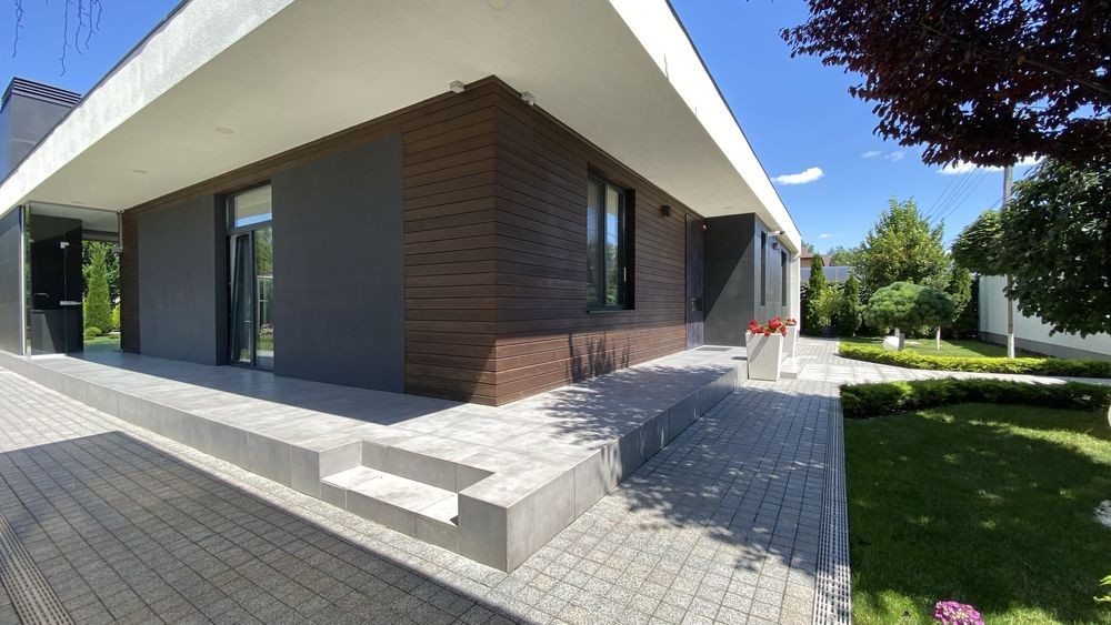 Фасад-декоративная штукатурка, итальянский керамогранит, лиственница.