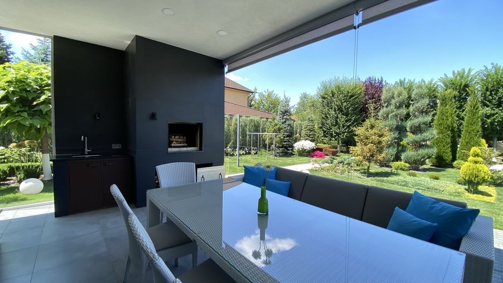 Терраса-керамогранит, закалённое стекло, солнцезащитные ролеты.