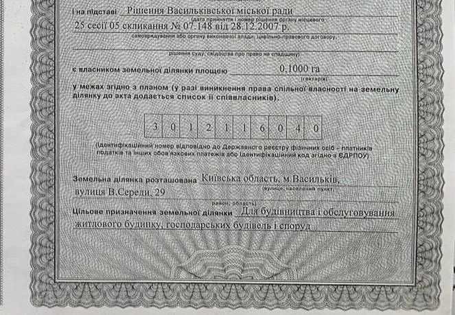 У місті Васильків (район Піски) продається земельна ділянка 10 соток з цільовим призначенням "для будівництва та обслуговування житлового будинку, господарських будівель та споруд", а також половина будинку, який розміщений на цій землі. Будинок по вулиці Середи, 29, офіційно поділений, має окремий договір на електрику. В будинку є довгий коридор, дві кімнати, ванна кімната, котельня (душ та туалет всередині будинку, вода заведена в будинок від скважини), а також велика кухня. Опалення в будинку: електричне та є твердопаливний котел, дровʼяна груба на частину будинку. Свіжий ремонт в будинку, є меблі та вся необхідна для життя побутова техніка (бойлер, пральна машина, плита, холодильник). Утеплений фасад мінеральною ватою, покрівля - ондулін. Накрита невелика тераса. На території ще є допоміжні господарські будівлі. Поруч розвинута транспортна інфраструктура (зупинка громадського транспорту), а також школа. Близько до Києва. Продаж без комісії, від власника. Витрати на оформлення пополам.