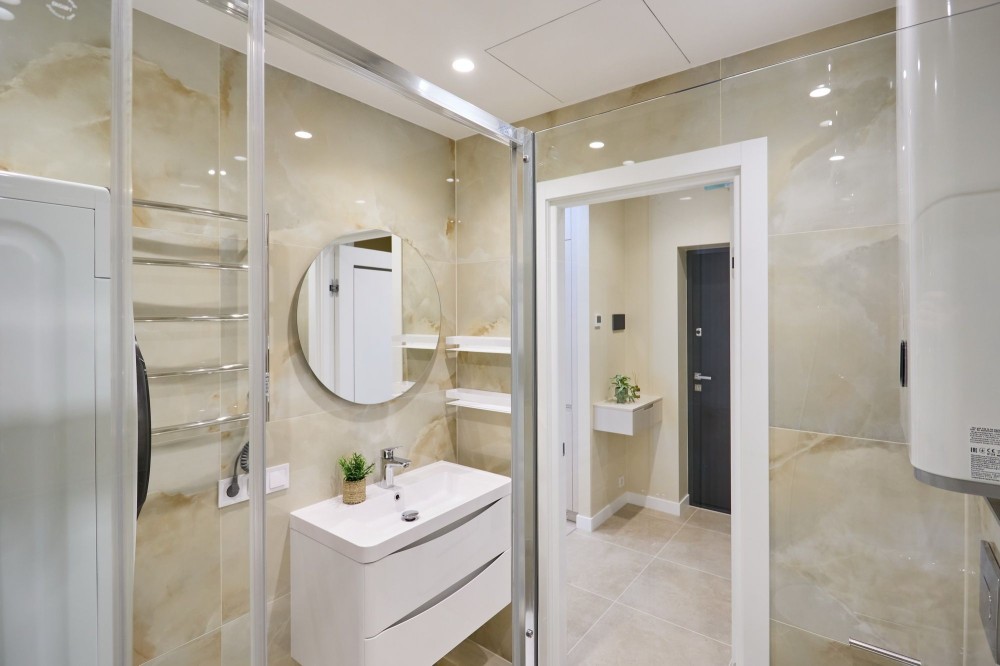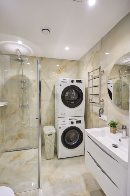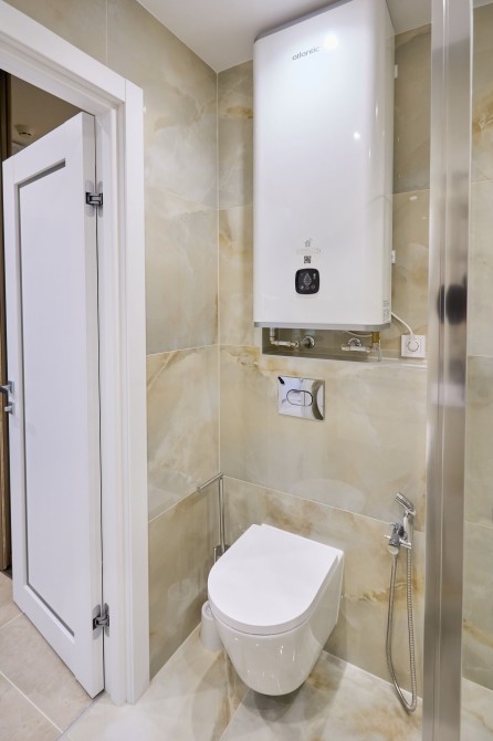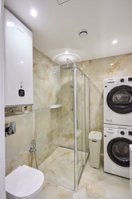 Санвузол сумісний в якісному кахелі з сантехнікою відомих брендів, гігієничний душ, великий бойлер 85 л., душова кабіна з тропічним та звичайним душем, електросушарка, дзеркало з підсвіткою, містка тумба.