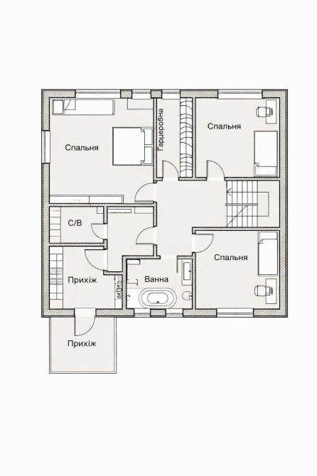 2-й поверх: три ізольовані спальні, дві гардеробні, два санвузли, горище 60 м².