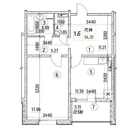 Площа: 54.35 м² (житлова – 17.96 м², кухня – 11.39 м²).