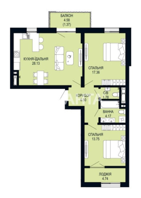 • Площа кухні 28.13 м2