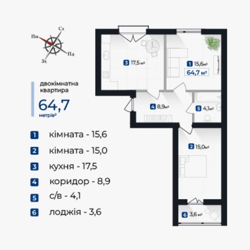 • Загальна площа 64.7 м2