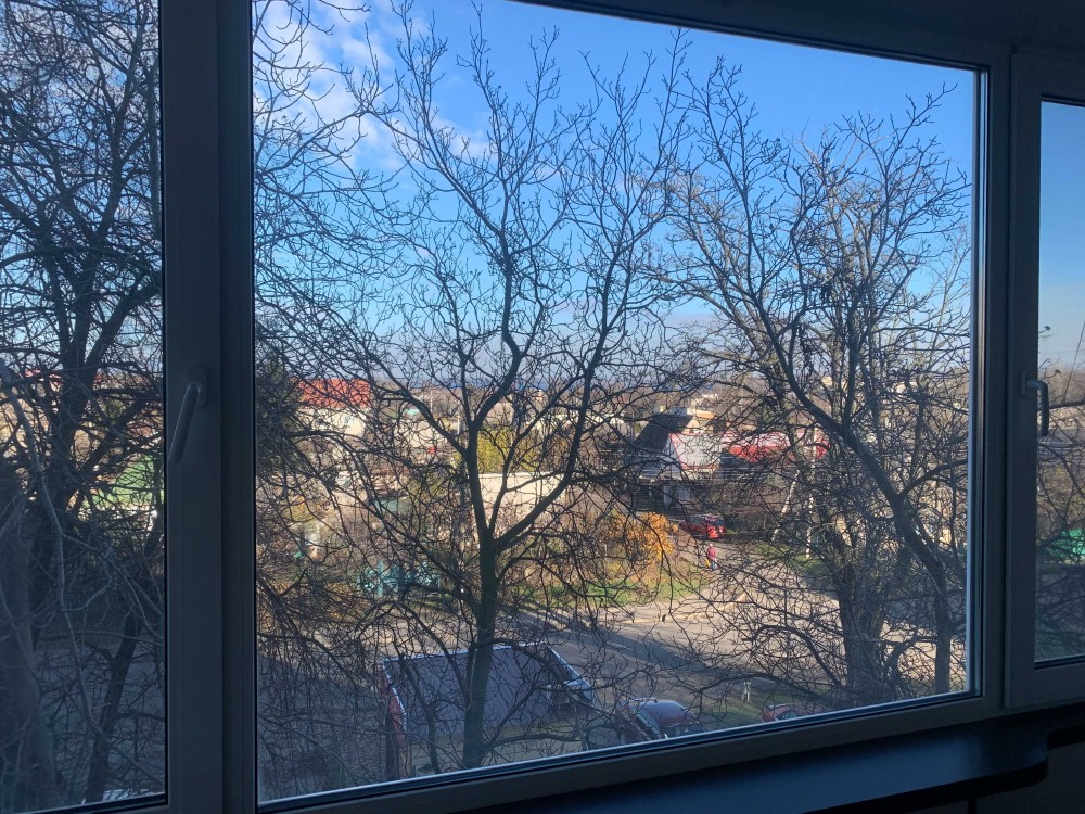 * Шикарний вид з вікна (влітку - зелені листя горіху утворюють тінь та затишок, восени - потужний осінній пейзаж того ж горіху, взимку відкривається вид на приватний сектор та на р. Дніпро)