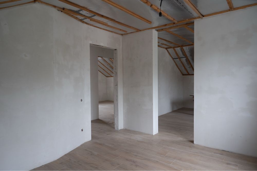 Підлога перший поверх-повністю плитка.другий також плитка під ламінат.Стіни готувались під фарбування.Стеля утеплена 250мм.перехресного утеплення мін.ватою.Два туалети(на першому роздільний з ванною,на другому лише туалет)