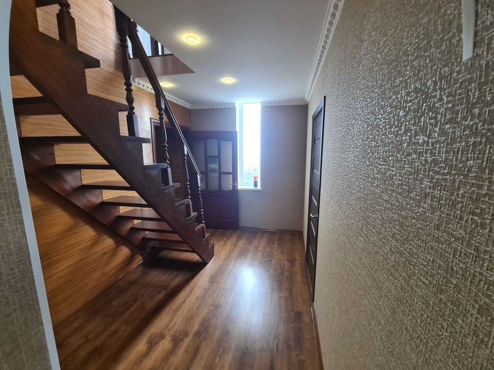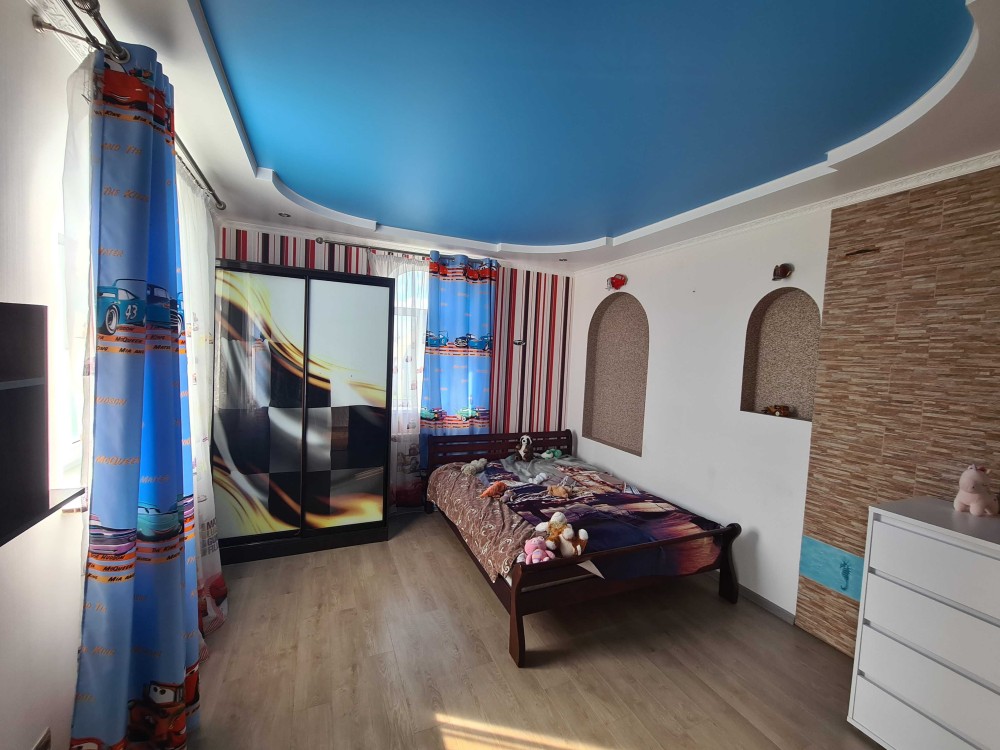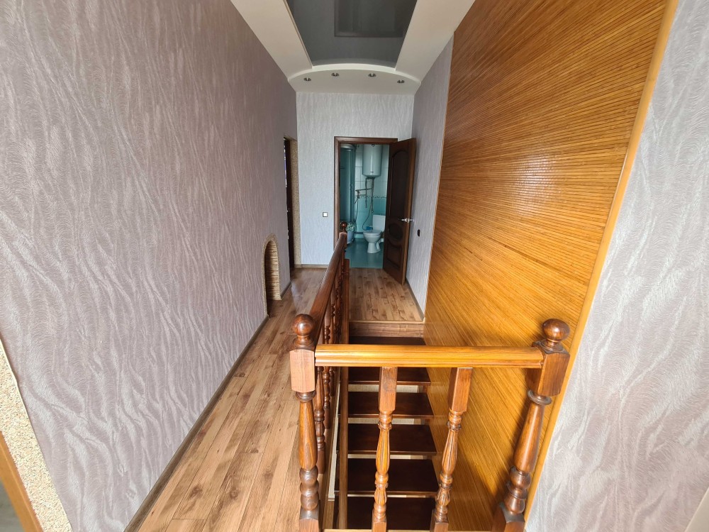 Продається двоповерховий будинок, коло річки, практично в центрі міста.Заг. площа першого поверху 59м.кв., прихожа 6.8м.кв., санвузол 3м.кв., гардеробна 3.5м.кв., тепла підлога, плитка, кухня12.8м.кв., вітальня24.5м.кв., балкон 6.95м.кв.коридор, сходова клітка, вихід на другий поверх 8.4м.кв. Заг. площа другого поверху 81.8м.кв., коридор-сходова клітка 9.5м.кв., житлова кімната 15м.кв, та 18.7м.кв., санвузол 4м.кв., передпокій13.5м.кв., житлова кімната18.7м.кв.гардеробна 4.1м.кв..В конструкцію будинку прибудований гараж, вхід з будинку та внутрішнього двору, приміщення для прання, санвузол. На першому поверсі, зі сторони внутрішнього двору до будинку прибудована літня кухня, з газом, водой та пічним опаленням(чугунна піч).Будинок мало експлуатувався, має гарний стан.В підвальному приміщенні дві кімнати, в одній твердопаливний котел, в другій технічна апаратура водопостачання, два контури водопостачання обладнані насосами, скважина та колодязь, двоконтурний водовідвід, душові кабіни, кухня відвід води для орошувальної системи в сад.Санвузол відвід води в каналізаційну яму великого об'єму. Опалення двоконтурний газовий котел, та твердопаливний котел, плюс пічне другий поверх.Вікна металопластикові, підлога ламінат, дах металочерепиця, горище будинку утеплене мін.ватою, стіни будинку ракушняк, обкладений цеглою, перший поверх зовні утеплений, літня кухня.На внутрішньому дворі гостьовий літньо-зимовий будиночок, зовні утеплений, має дві кімнати, кухню, санвузол, та пічне опалення. Надвірний туалет під'єднаний до води та каналізації. На внутрішньому дворі з двох сторін обладнані дві бесідки-альтанки для барбекю та відпочинку, з виходом на садок та річку.Зі сторони дороги, на внутрішньому дворі забетоноване місце під гараж-стоянку для авто.Навколо будинку бетоновані доріжки та сходи, та викладені доріжки з плитки.В нижній частині земельної ділянки прямий вихід до річки.Будинок, подвір'я та сад обладнані всім необхідним для комфортного проживання.Будинок продається з меблями. Перегляд за попередньою домовленістю. Аргументований торг.