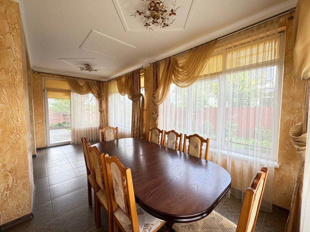 В будинку дві кухні: Основна простора, з сучасним кухонним гарнітуром, вбудованою технікою, витяжкою та великою робочою зоною. Світлий обідній простір із панорамним вікном створює ідеальні умови для приємних сніданків.