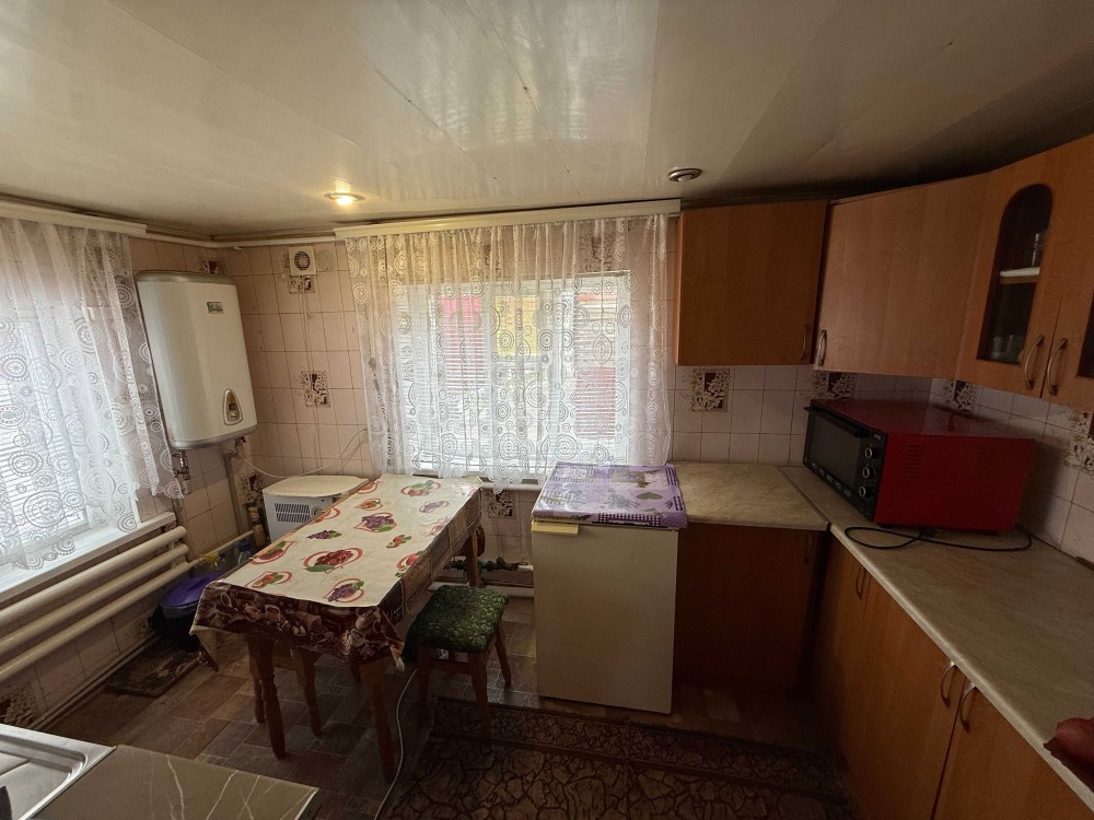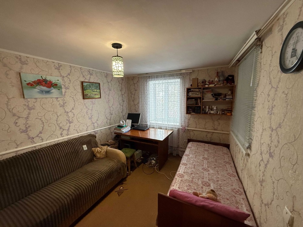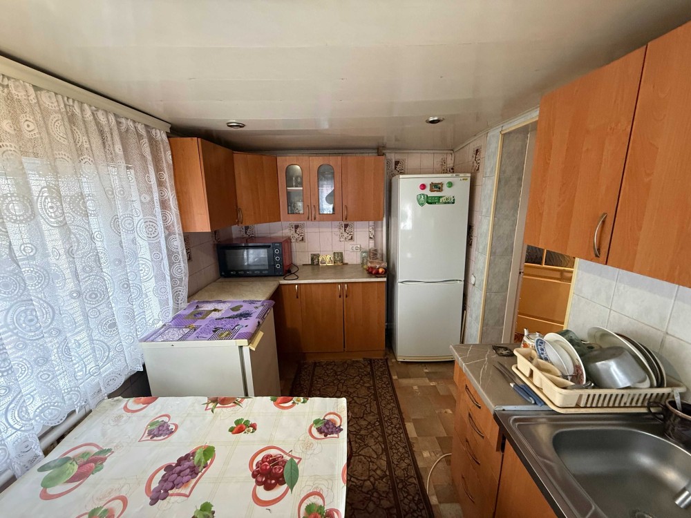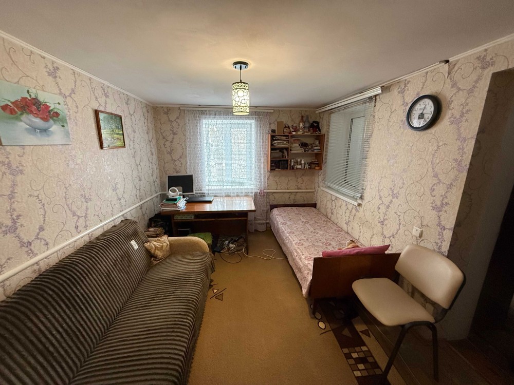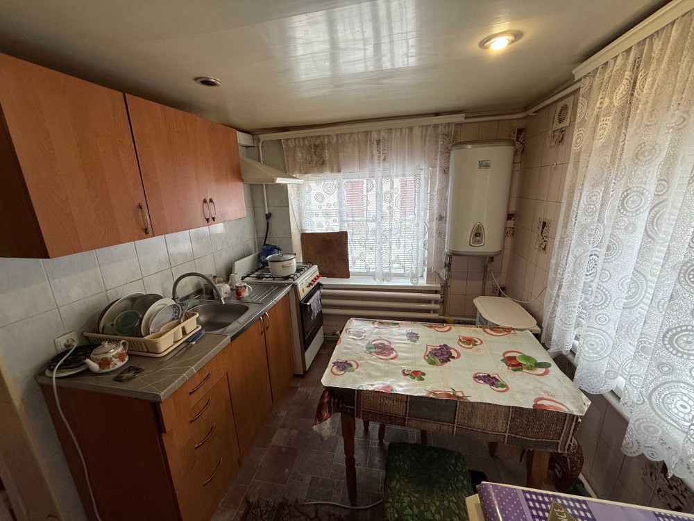 Продається частина будинку, із своїм двором та земельною ділянкою. Загальна площа 48.2м.кв., житлова 23.8м.кв., дві кімнати, кухня 8.5м.кв., веранда 9.4м.кв., коридор 3.8м.кв., санвузол 2.9м.кв.. Зроблений капітальний ремонт. Стіни саман, плюс цегла, утеплений фундамент, підлога стяжка, плюс утеплювач і лінолеум. Вікна метало пластикові. Стіни і стелі гіпсокартон, шпалери. Двері нові, дерев'яні. Санвузол кахель. Централізоване водопостачання та каналізація. Опалення газовий котел, може працювати без електрики. Будинок утеплений, економний по опаленню. Двір викладений плиткою, погріб. Сарай на дві частини, в одній літня кухня з газом, електрикою. Земельна ділянка в користуванні 6 соток, садок із фруктовими деревами. Поряд магазин 200 метрів, кафе, автобусна зупинка 100 метрів. До центру міста 800 метрів, до Ощадбанку 600 метрів. До будинку асфальт, поряд річка та парк.