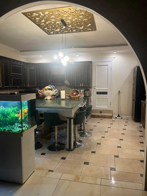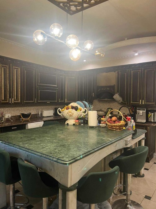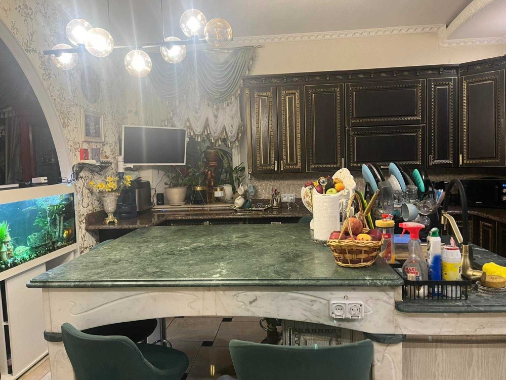 На першому поверсі знаходиться кухня-їдальня з шикарним мармуровим островом, велика гостинна, санвузол та спальня.