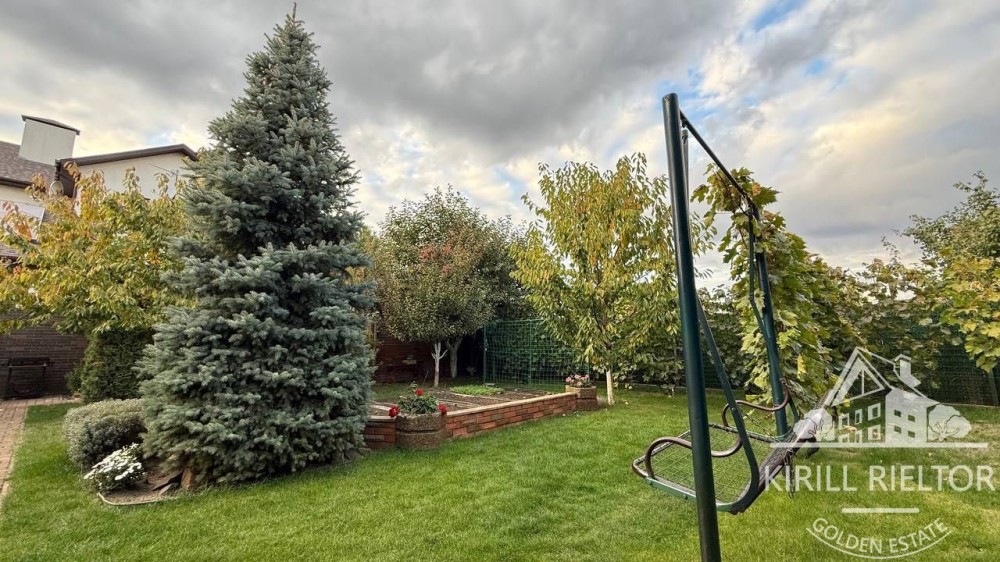 Во дворе уложен рулонный газон, сделан автоматический полив, высажены фруктовые и декоративные деревья и кустарники. Автоматические ворота и крытая парковка.