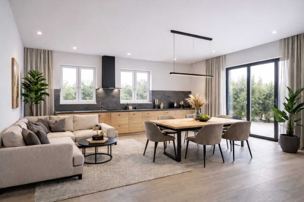 Правильное расположение дома по сторонам света: оптимизирует естественное освещение и снижает расходы на отопление. Жилые комнаты (гостиная, спальни, детская) ориентированы на юг, юг/юго-восток и юго-запад для максимума света, юг: идеален для гостиной, террасы, обеспечивает максимальное естественное освещение в течение всего дня, делая комнаты светлыми, теплыми и уютнымии, а хозяйственные помещения (кладовые, котельные) расположены на севере.
