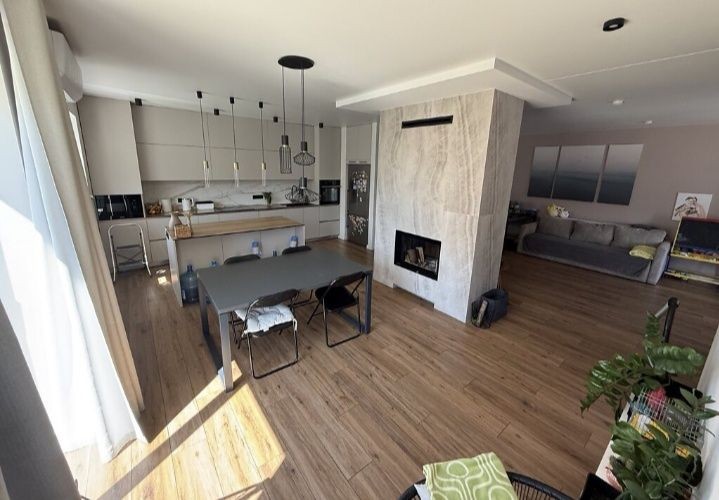 Простора кухня-вітальня з двостороннім каміном у центрі. Камін — справжнє серце будинку, він обігріває перший та другий поверх, тому взимку в будинку дуже тепло і система опалення працює на мінімальних температурах.